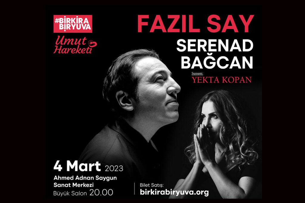 Dünyaca ünlü piyanist ve besteci Fazıl Say ve solist Serenad Bağcan İzmir’de depremzedelerin yararına konser verecek. İzmir Büyükşehir Belediyesi’nin ev sahipliğinde 4 Mart 2023 Cumartesi günü gerçekleşecek dayanışma konseri Ahmed Adnan Saygun Sanat Merkezi’nde izlenebilecek. Yardım konserinin gelirinin “Bir Kira Bir Yuva” kampanyasına aktarılacağını söyleyen İzmir Büyükşehir Belediye Başkanı Tunç Soyer, “Kıymetli dostum Fazıl Say’ın teklifi ile gelirin tamamen deprem bölgesine bağışlanacağı bir dayanışma konseri düzenliyoruz. Biletlerinizi bugünden itibaren ‘birkirabiryuva.org’ adresinden alabilirsiniz. Gelin yaraları birlikte sarmaya devam edelim. Konsere gitmeseniz de bilet alarak destek olun” dedi.