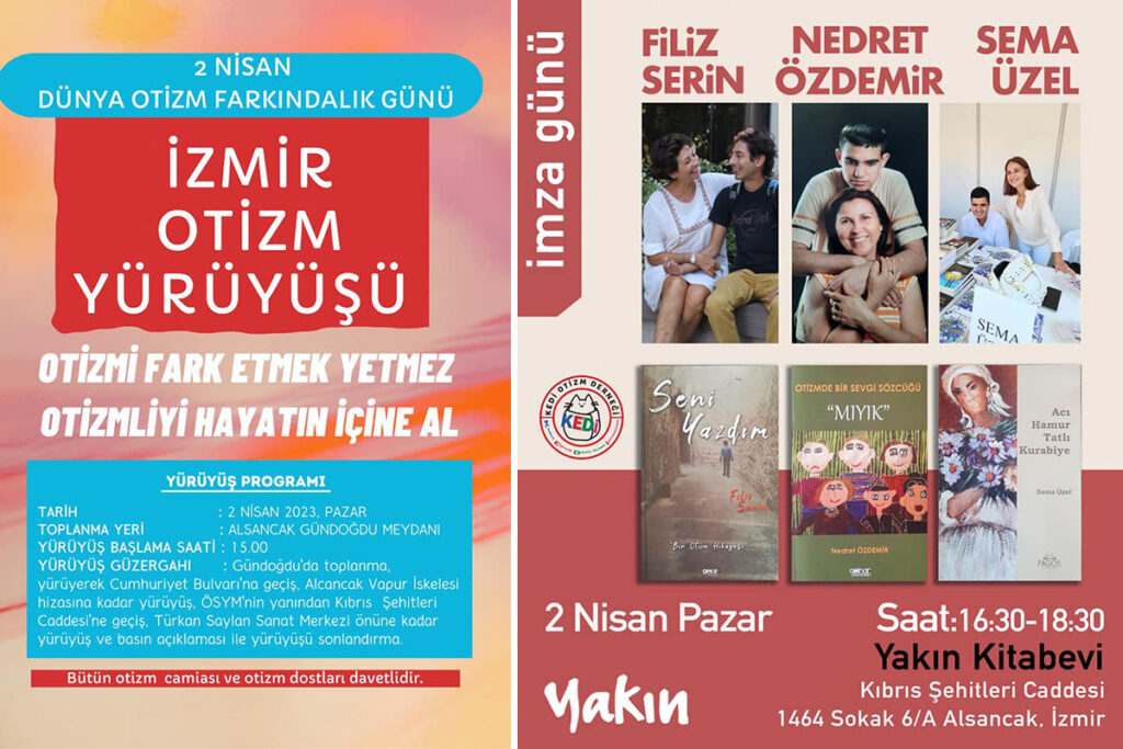 Dünya Otizm Farkındalık Günü’nde bir başka etkinlik ise Alsancak’taki Yakın Kitabevi’nde gerçekleştirilecek. KEDİ Otizm Derneği öncülüğünde yapılacak imza günü 2 Nisan 2023 Pazar günü saat 16.30 – 18.30 arasında gerçekleşecek. Yazarlar Filiz Serin “Seni Yazdım”, Nedret Özdemir “Otizmde Bir Sevgi Sözcüğü: Mıyık”, Sema Özel ise “Acı Hamur Tatlı Kurabiye” adını taşıyan, otizm konusunda yaşadıkları deneyimleri kaleme aldıkları kitaplarını imzalayacak. Yazarlar kitaplarıyla da otizm konusuna dikkat çekecek.