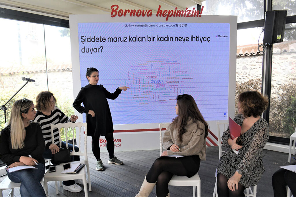 Bornova Belediyesi Kent Arşivi ve Müzesi Dramalılar Köşkü’nde gerçekleşen toplantıda Mor Çatı Kadın Sığınağı Vakfı gönüllüleri Tülin Semayiş, Melike Keleş ve Açelya Uçan konukları bilgilendirdi. Kadın Dayanışma Merkezi’nin işleyişinin konuşulduğu toplantıda katılımcılar deneyimlerini de paylaştı. Katılımcılara “Kadına Yönelik Şiddetle Mücadelede Destek Mekanizmaları nelerdir?”, “Sığınak Nedir?”, “Sığınağa ne zaman ihtiyaç duyulur?”, “Şiddete maruz kalan kadın neye ihtiyaç duyar?” konularında eğitim verildi.
