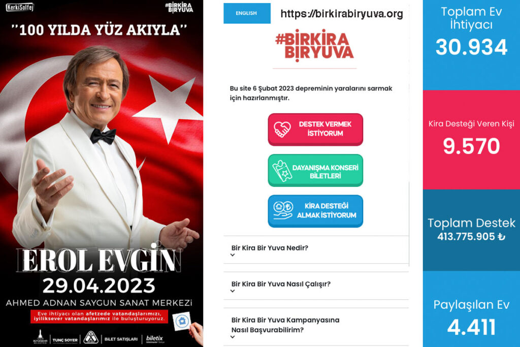 Türk Pop Müziği’nin sevilen sanatçılarından Erol Evgin, İzmir Büyükşehir Belediyesi’nin depremzedeler için başlattığı “Bir Kira Bir Yuva” kampanyasına konserle destek verecek. “100 Yılda Yüz Akıyla” adını taşıyan konser 29 Nisan 2023 Cumartesi günü saat 20.30’da Ahmed Adnan Saygun Sanat Merkezi’nde gerçekleşecek. Konserin gelirinin tamamı Bir Kira Bir Yuva kampanyasına bağışlanacak.
