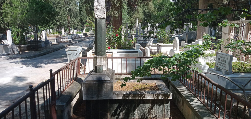 Yeşil-beyaz mermerlerin ustaca harmanlandığı mezara gelince… “Merhum Şeyh Ahmet Efendi Refikası, Merhum Hayreddin Bey’in ve Mimar Necmeddin Emre’nin Anneleri Hatice Nükhet Hanım’ın Ruhuna Fatiha 19-8-1932” yazılı kitabesinde, Mimar Necmeddin Emre adını görmek, mezara ilgimi daha da artırdı…1922 İzmir yangını sonrası kentin imarında görev alıp, özgün yapılar tasarlamış, Birinci Ulusal Mimarlık Dönemi mimarları arasında yer alan, Sanayi-i Nefise Mektebi’nde mimarlık eğitimi görmüş (1913) Devlet Tiyatrosu, Gazi İlkokulu, Mimar Kemalettin Caddesi’nde inşa ettiği Silahçıoğlu ve Akseki hanları gibi bir çok esere imza atmış, Mimar Necmeddin Emre adına yabancı değildim…