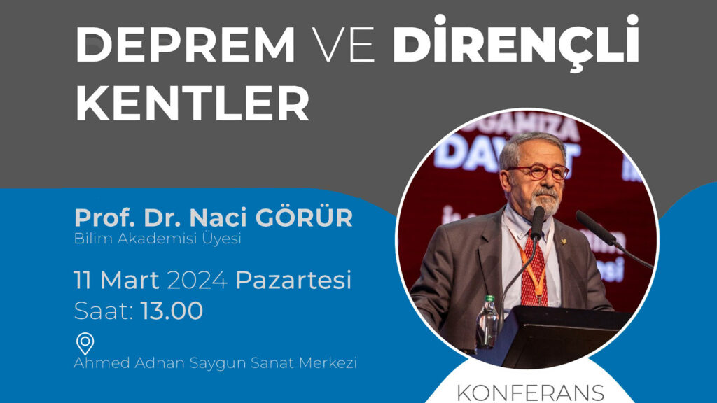 İzmir Büyükşehir Belediye Başkanı’nın düzenlediği etkinlikte Bilim Akademisi Üyesi Prof. Dr. Naci Görür “Deprem ve Dirençli Kentler” konulu konferans verecek. Ahmed Adnan Saygun Sanat Merkezi’ndeki (AASSM) konferans, 11 Mart 2024 Pazartesi günü saat 13.00’da başlayacak. Etkinlikte Prof. Dr. Naci Görür deprem ve dirençli kentler başlığı altında bilgiler paylaşacak.
