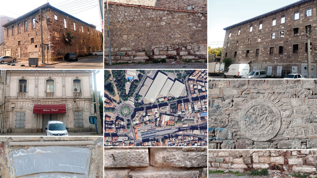 Basmane Garı’nın kuzey doğusunda Ermeni ve Rum mahallelerinin sınırında bulunan, eski bir yapıdan kalma duvarın temellerinde Roma ya da Erken Bizans Dönemi blok taşları görülmektedir. Aynı bölgede dikkat çeken endüstriyel mirası niteliği taşıyan yapılar ve cephelerinde bulunan sembol anlamı taşıyan isimli ve bezemeli taşlar ilgi çekicidir. 1264 Sokak’la 1267 Sokak’ın kesiştiği parselde Antik Dönem ustaları tarafından yontulmuş blok taşlarının bulunduğu yerde 1922 İzmir yangını öncesi hangi yapı vardı? Duvarda kullanılan taşlar, başka bir yapıdan devşirme olabilir miydi?