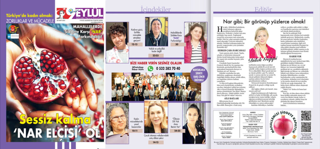 “Kadın gücü birlikte mücadele etmekten geçiyor” diyen Balatçık Mahallesi Muhtarı Hayat Laçinkaya’nın kurduğu dayanışma ağının anlatıldığı Nar özel ekinde, ‘Karabağlar Arap Hasan Mahallesi Muhtarı Funda Karakaş’ın şiddete karşı yürüttüğü örnek çalışmalar da yer alıyor. Özel ekte, 9 Eylül Gazetesi Whatsapp İhbar Hattı da (0532 382 70 40) içinde olmak üzere, yardımcı olabilecek tüm resmi kurumların iletişim numaralarına yer veriliyor.